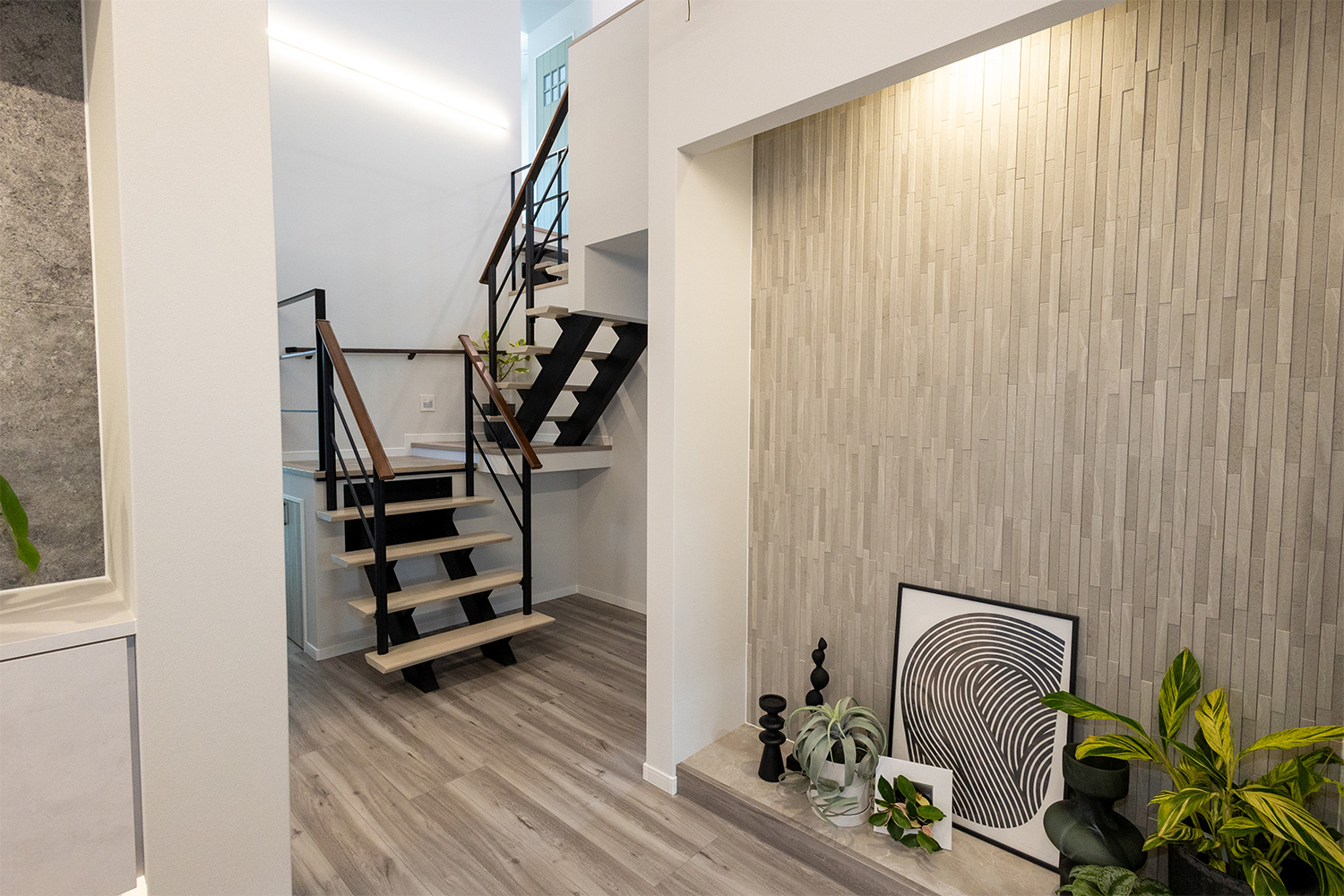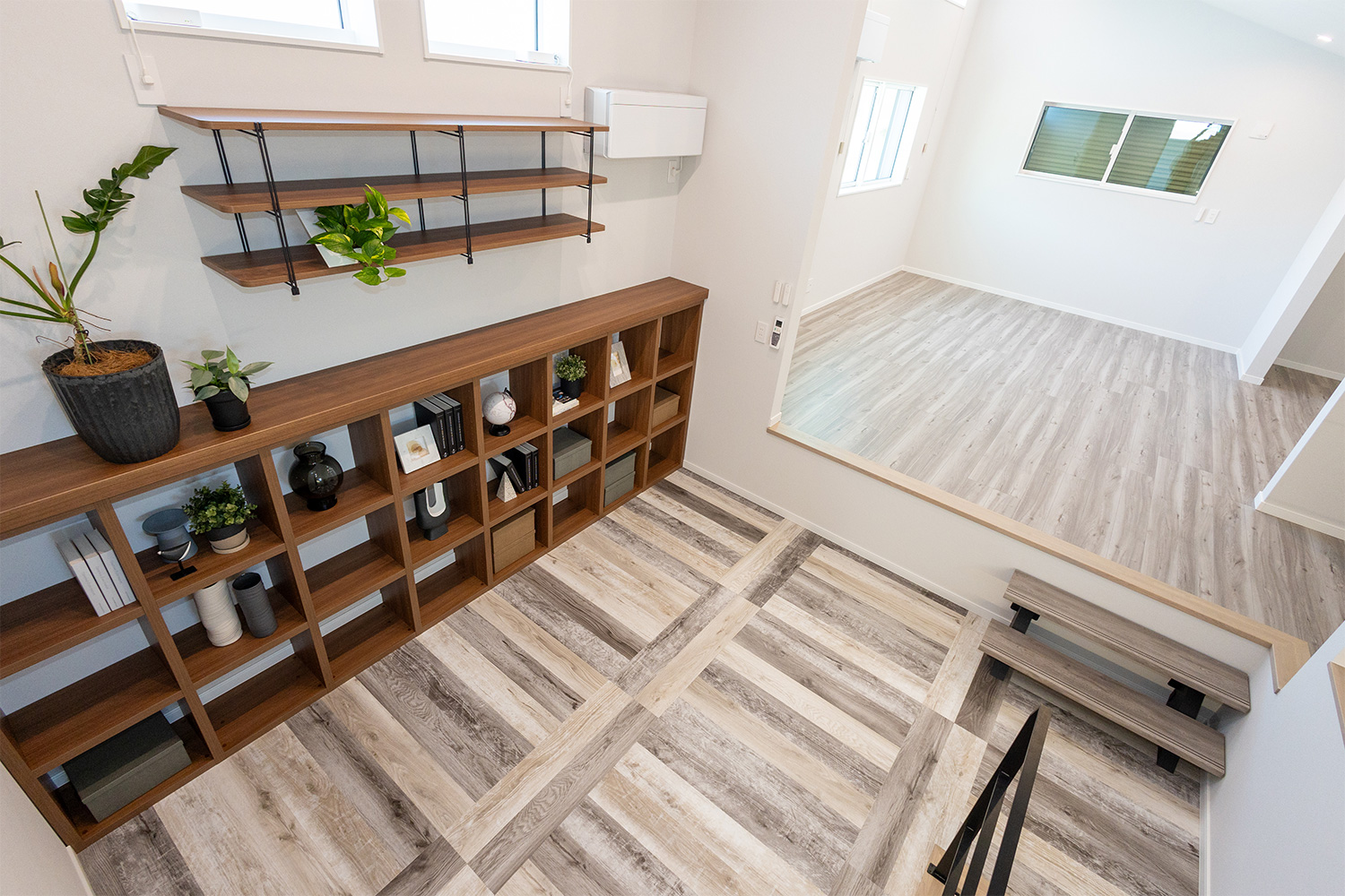 隣には便利な収納スペースを設けており、靴や日用品はもちろん、ベビー用品もすっきりと片付きます。毎日の出入りがスムーズになるだけでなく、子育て世帯にもやさしい使い勝手の良さが魅力の玄関です。