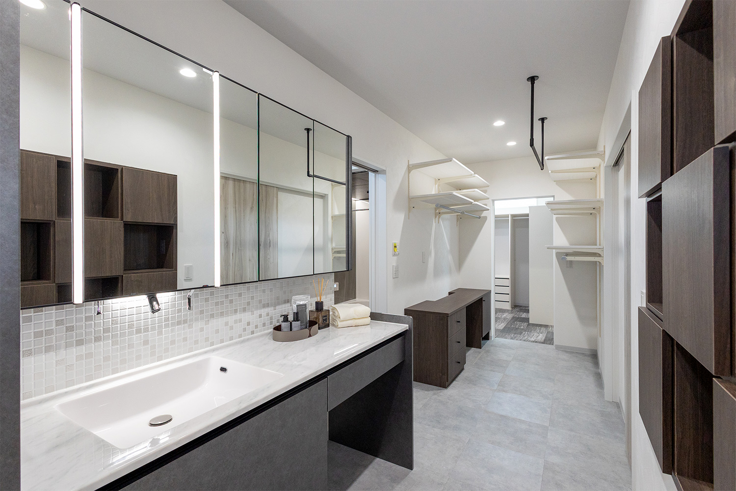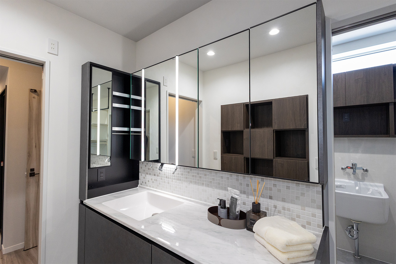 ゆとりある広さの洗面所は、二人並んで朝の身支度ができる快適な空間。忙しい朝でも順番待ちをすることなく、それぞれのペースで準備が整います。使い勝手に配慮した設計と十分なスペースが、毎日の時間にゆとりを生み出し、心地よい一日のスタートを支えます。