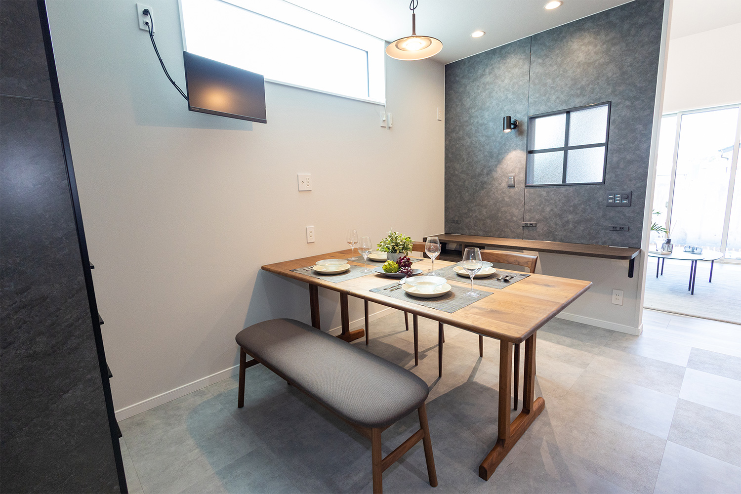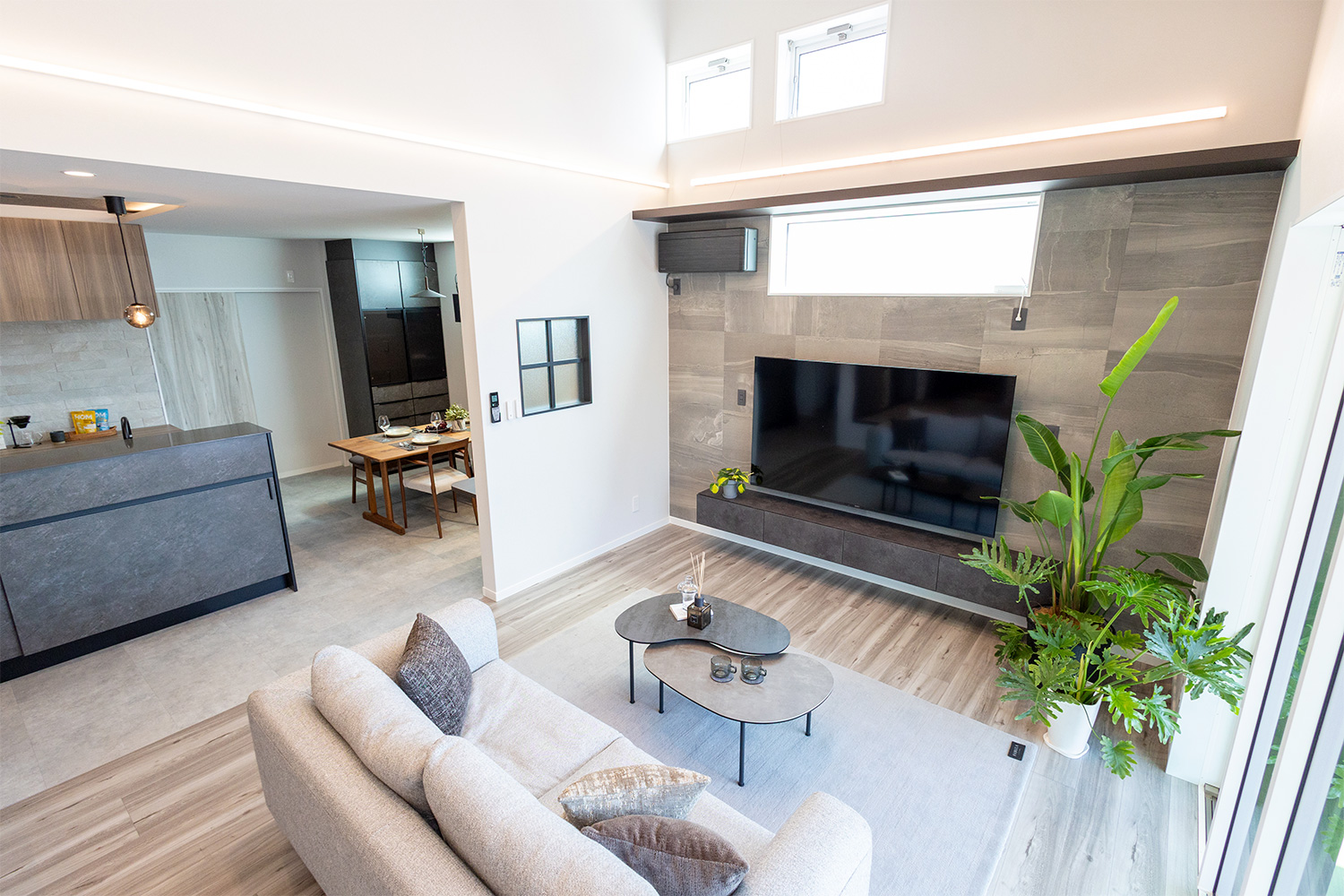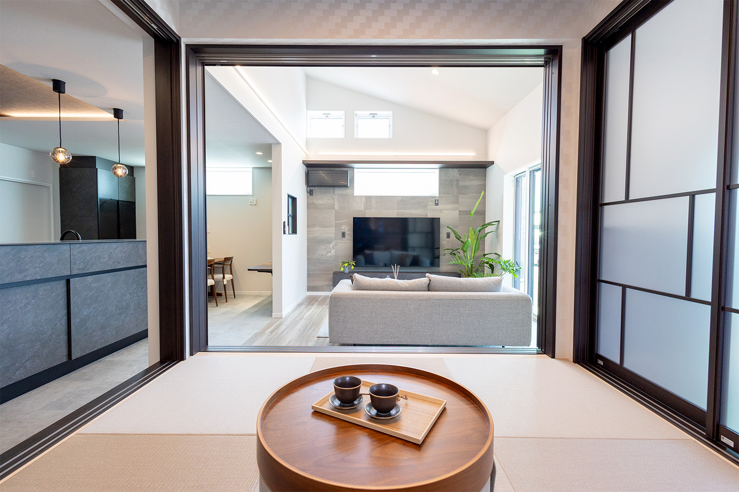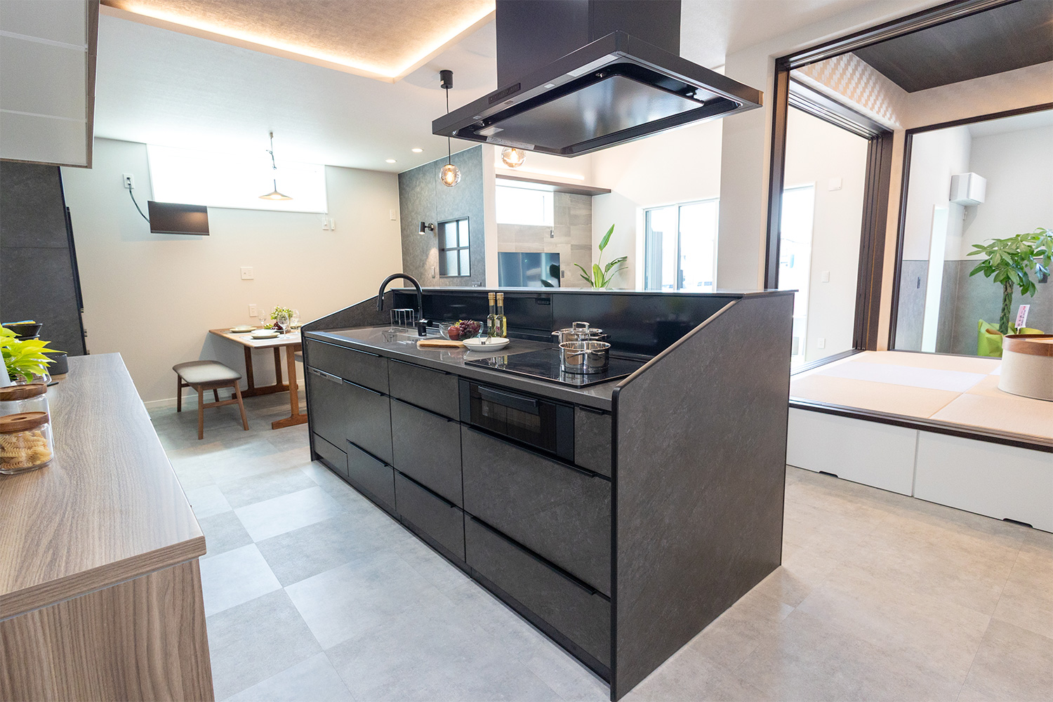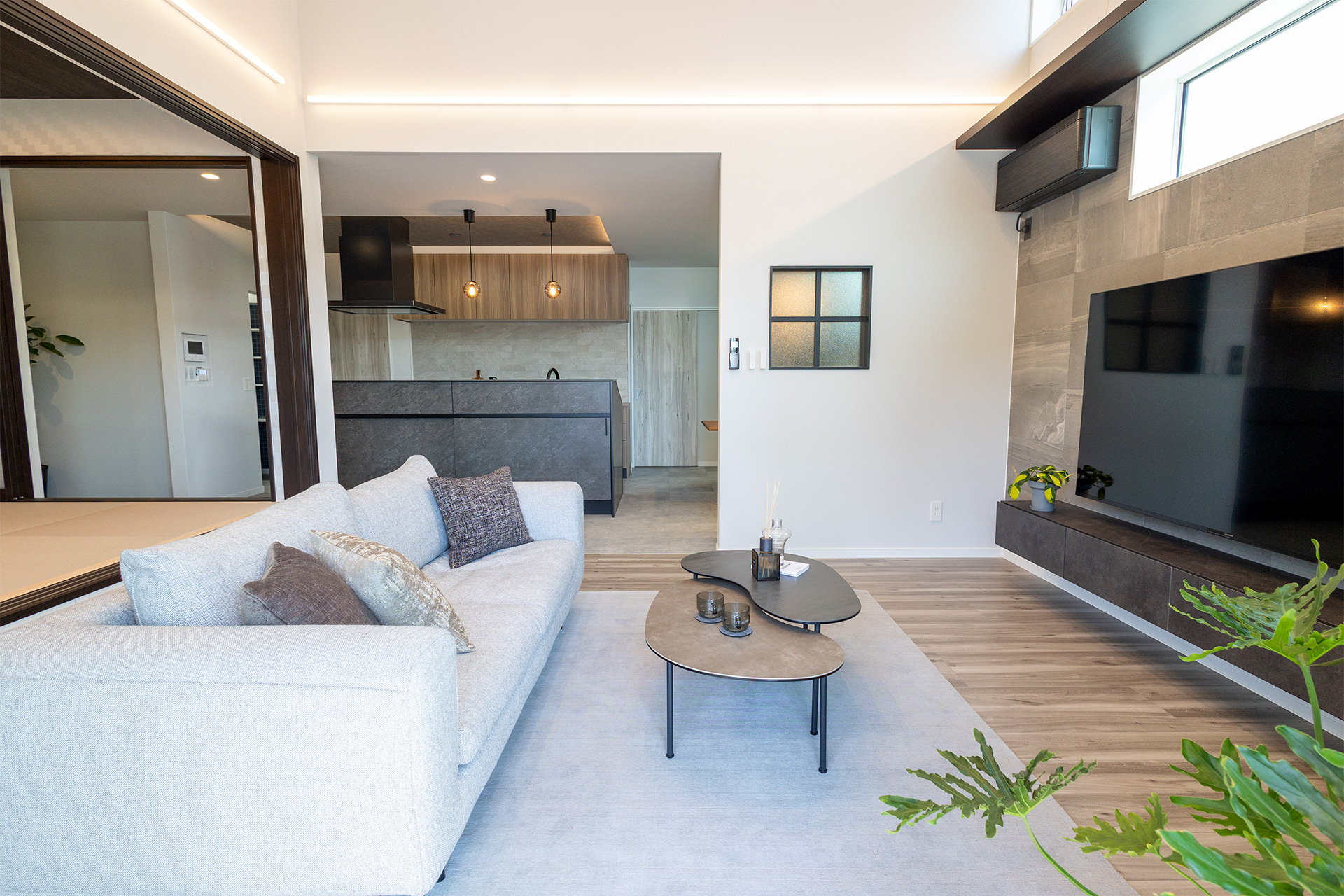 開放感あふれるLDKは、どこにいても家族の気配を感じられる一体感のある空間。システムキッチンからはリビングや和室、ダイニングまで見渡すことができ、料理をしながらでも自然と会話が生まれます。家族それぞれが思い思いの時間を過ごしながら、ゆるやかにつながる心地よい暮らしを叶えます。
