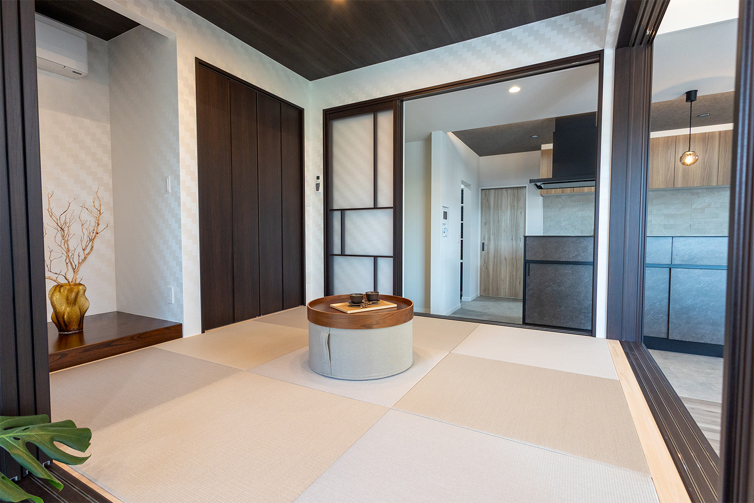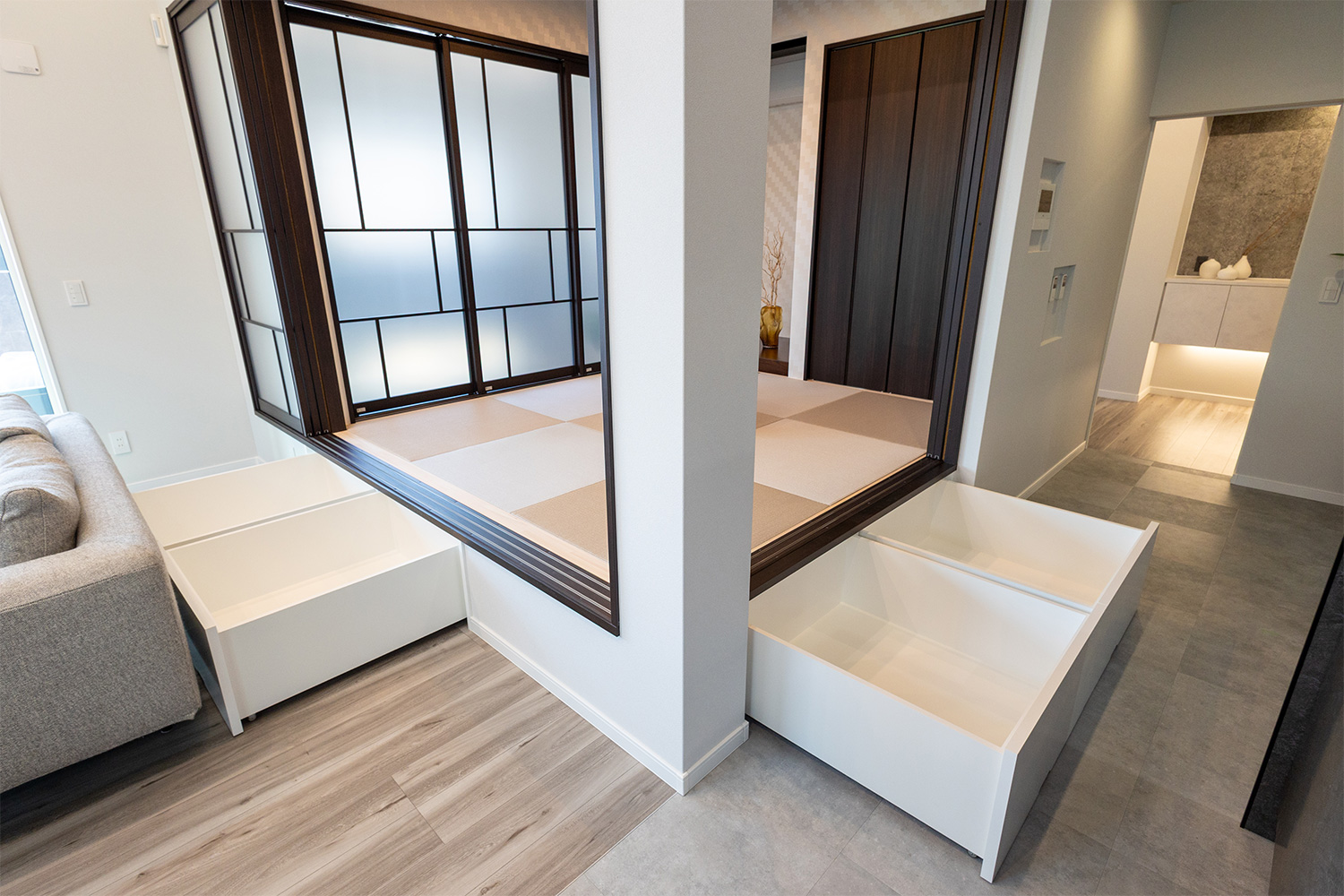 リビングの一角には、小上がりの和室を設けました。腰を掛けてくつろいだり、お子さまの遊び場やお昼寝スペースとしても活躍する、暮らしに寄り添う空間です。段差を活かした床下収納も備えており、季節物や日用品をすっきりと整理可能。くつろぎと機能性を兼ね備えた、使い勝手の良い和のスペースです。